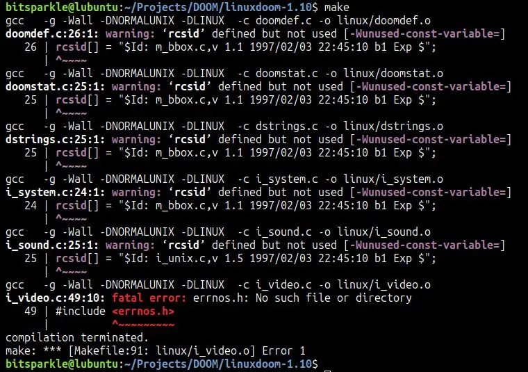 Quindi ho clonato il progetto e ho lanciato il classico comando make. Come prevedibile non ha funzionato. Stiamo parlando di un sorgente rilasciato nel 1997, troppe cose sono cambiate nei compilatori da allora, e soprattutto i sistemi non sono più a 32 ma a 64 bit.