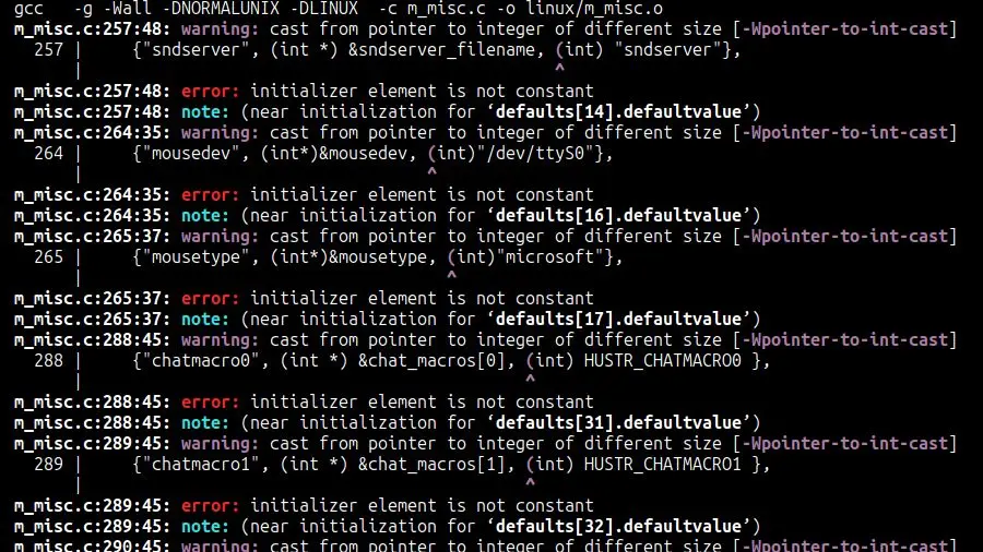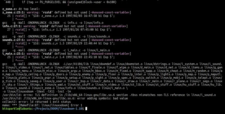 A parte tanti warning assolutamente ignorabili, tutto il codice è stato compilato correttamente (almeno in apparenza), c’è solo un problema con il linker. Quello che si capisce è che si tratta di un problema sul file i_sound.c, anche se non ci viene detto null’altro.
